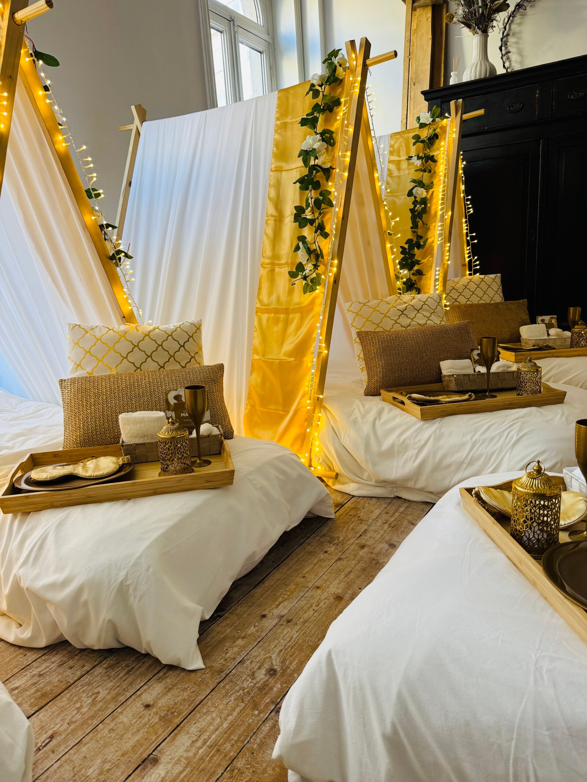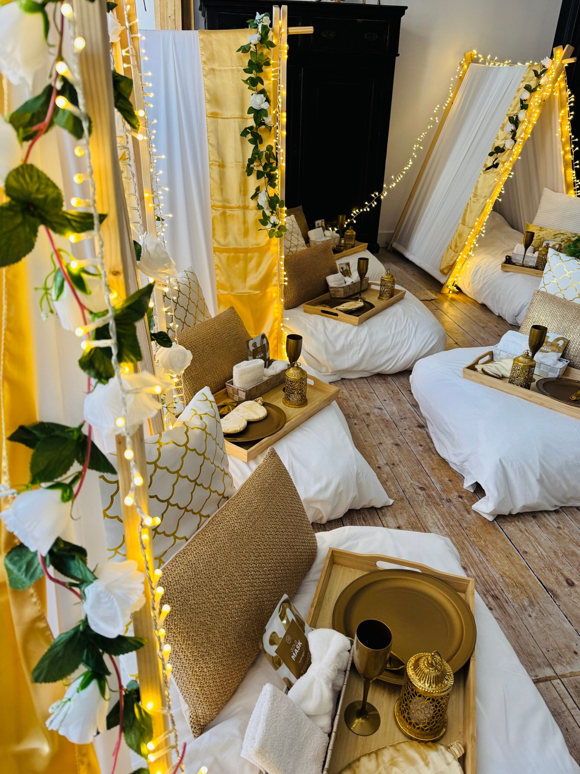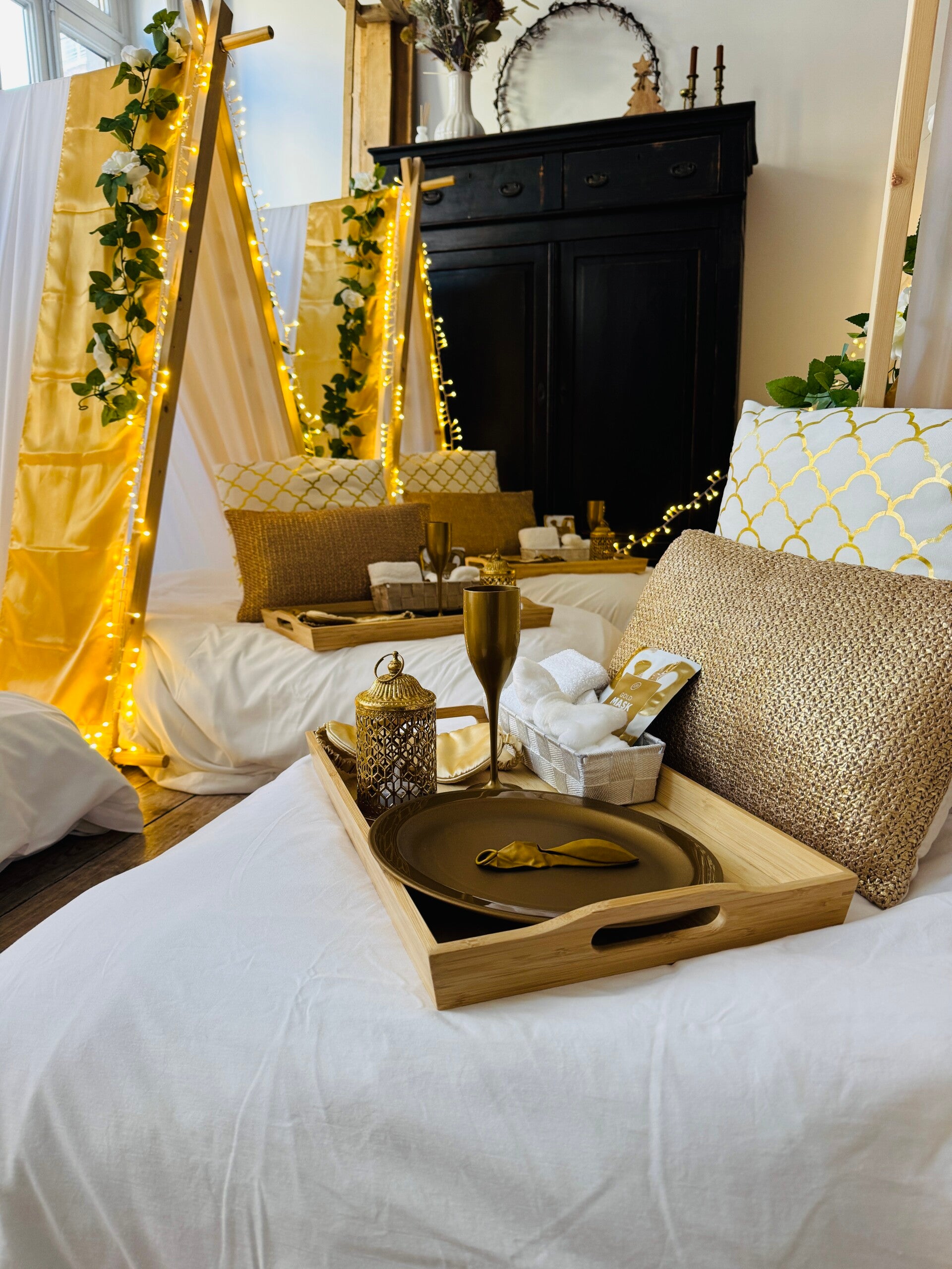 In het thema Golden Dream krijgt u een magische en betoverende slaapervaring. Golden Dream staat voor een perfect luxe slaapfeestje. Deze white and gold sleepover is ontworpen met oog voor detail. Gouden sierkussens, gouden glitter vlaggen, witte rozen, sfeervolle verlichting, zachte kussens, warme dekens en leuke accessoires om het slaapfeestje helemaal compleet te maken.