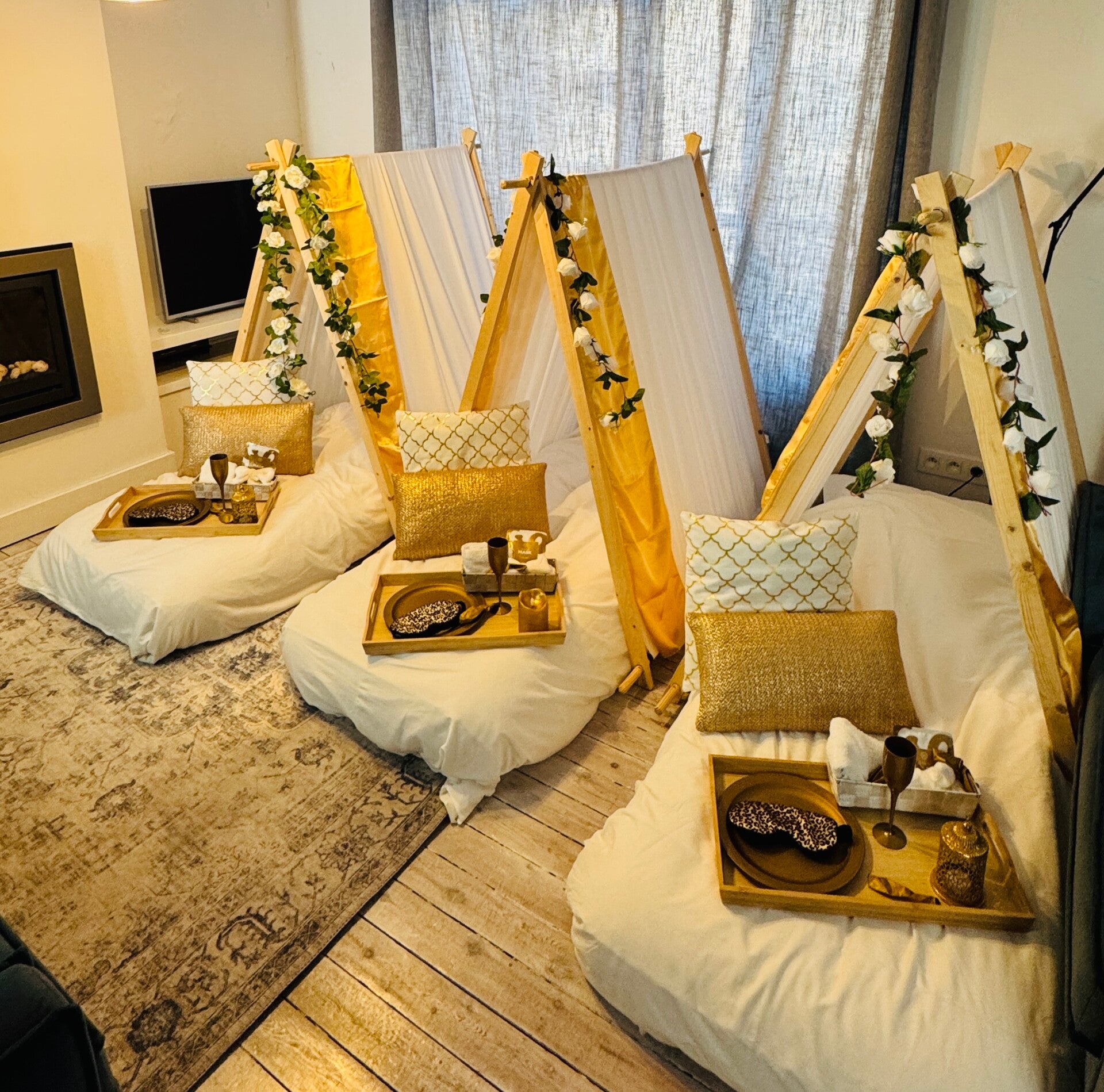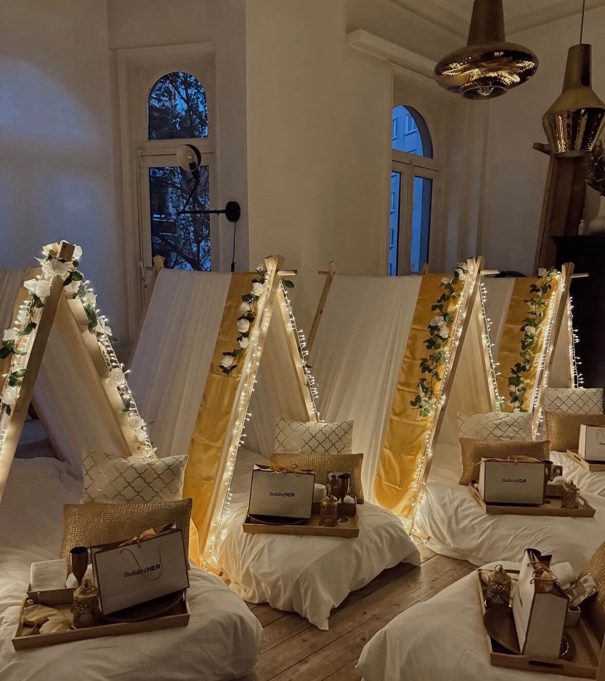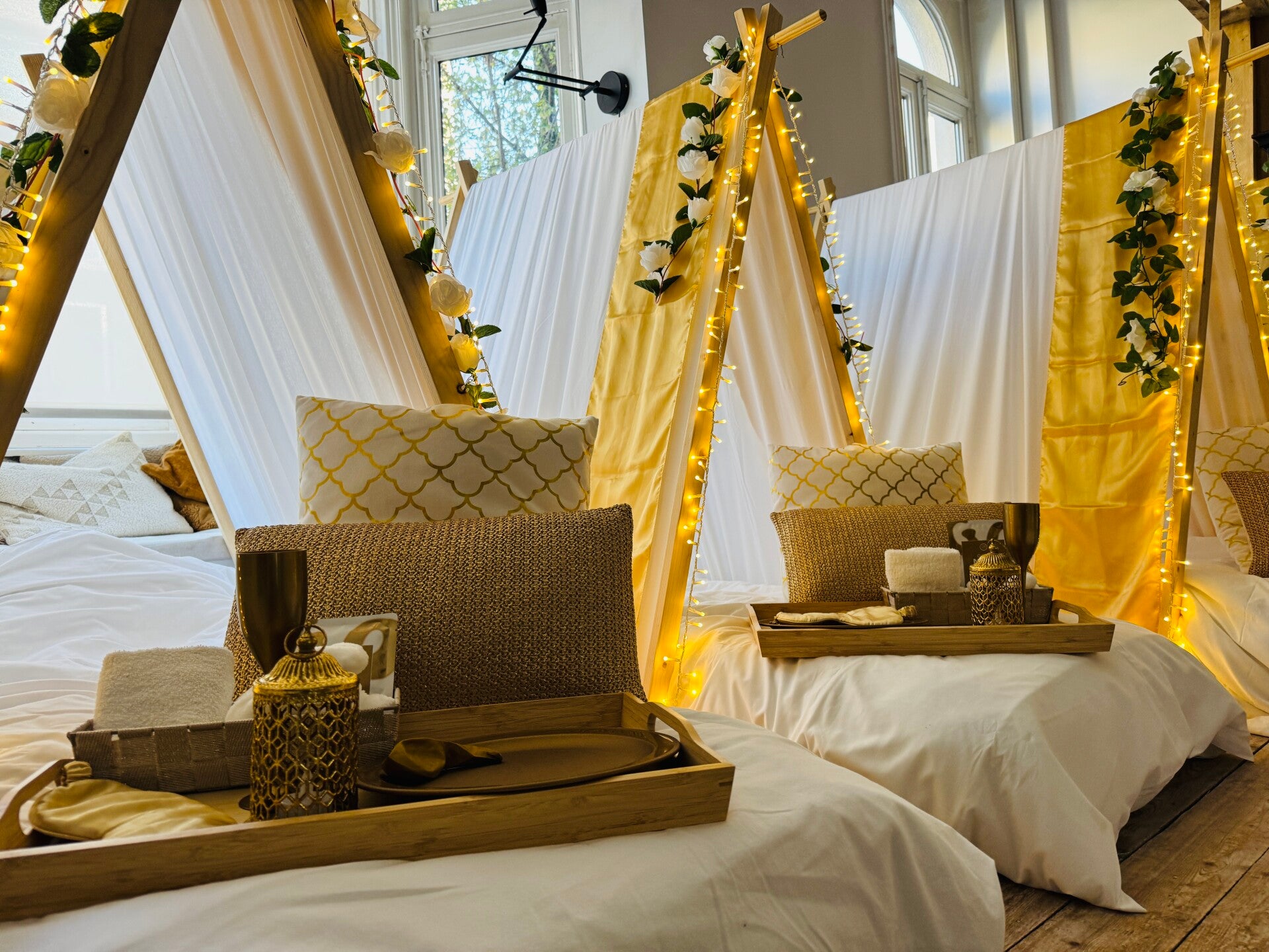 In het thema Golden Dream krijgt u een magische en betoverende slaapervaring. Golden Dream staat voor een perfect luxe slaapfeestje. Deze white and gold sleepover is ontworpen met oog voor detail. Gouden sierkussens, gouden glitter vlaggen, witte rozen, sfeervolle verlichting, zachte kussens, warme dekens en leuke accessoires om het slaapfeestje helemaal compleet te maken.