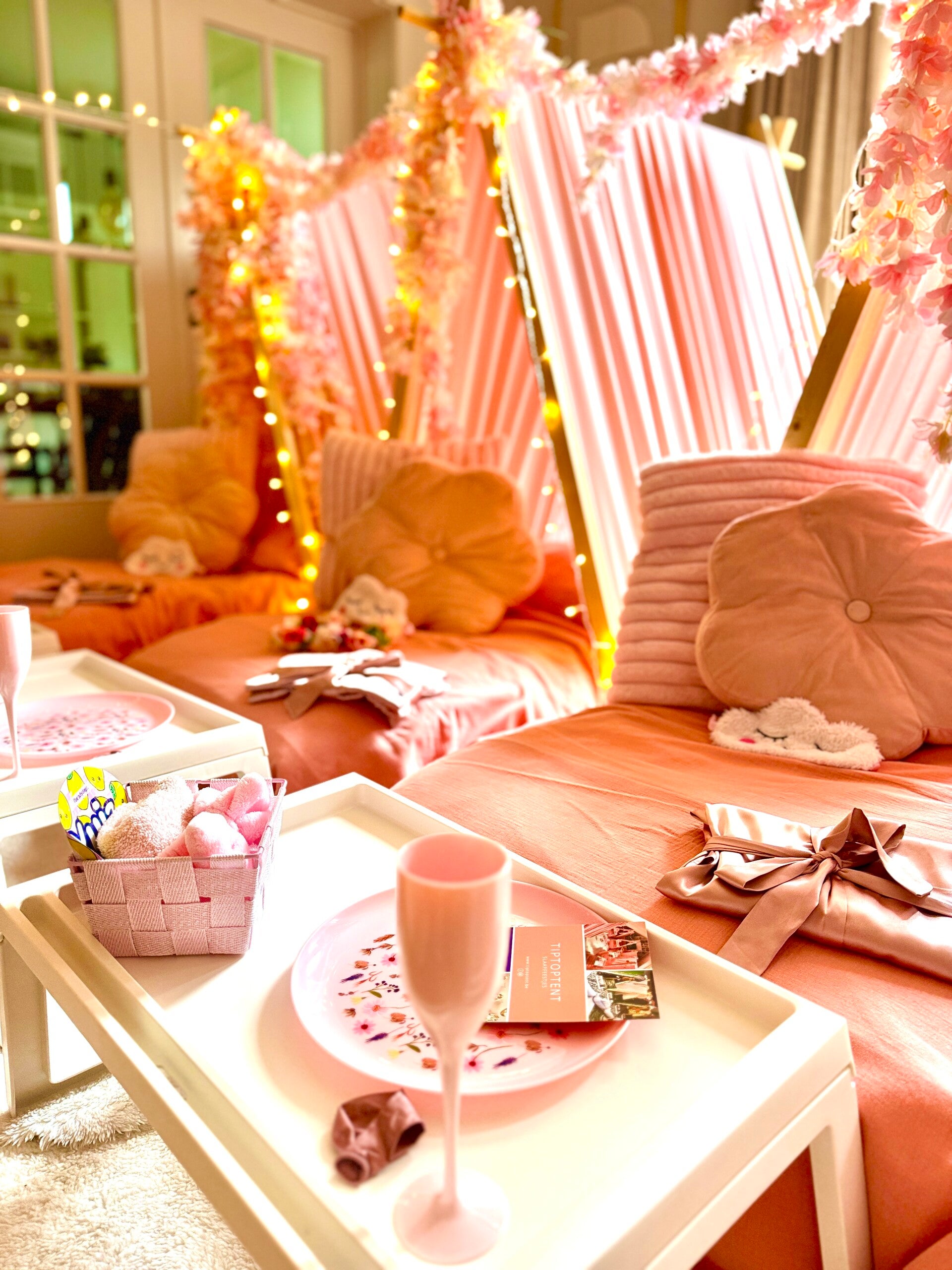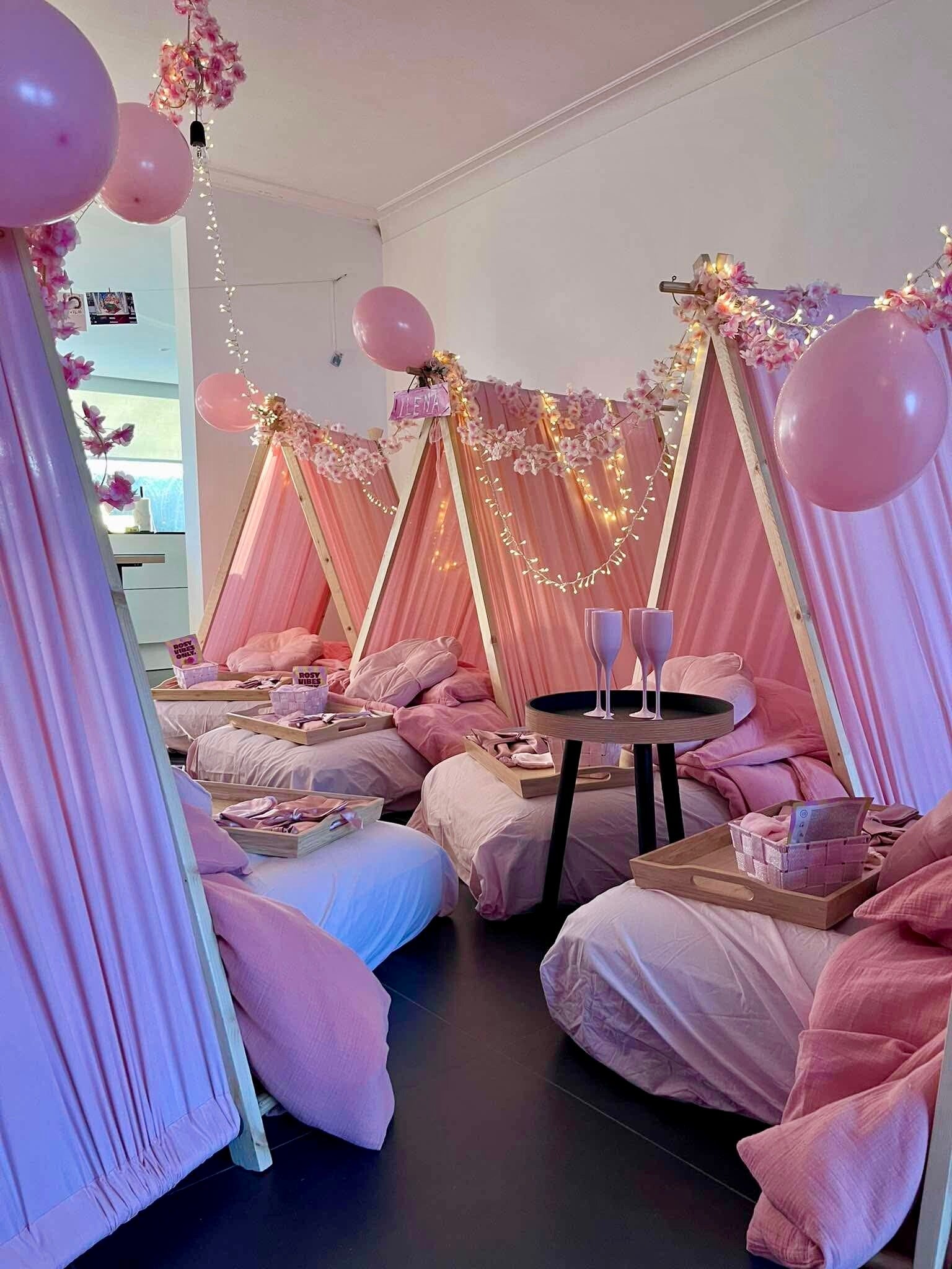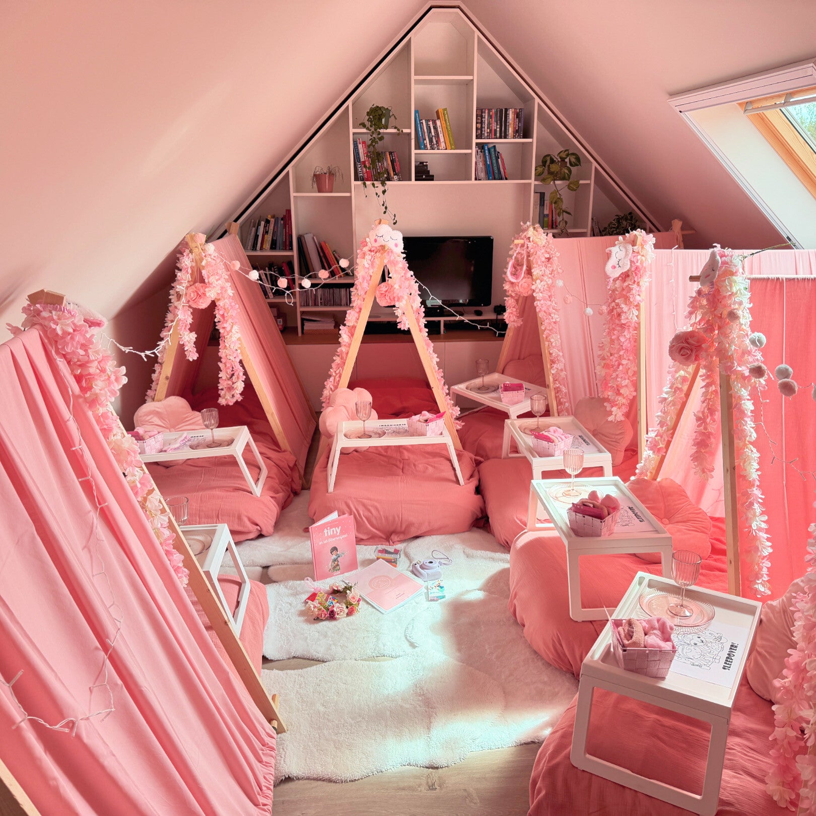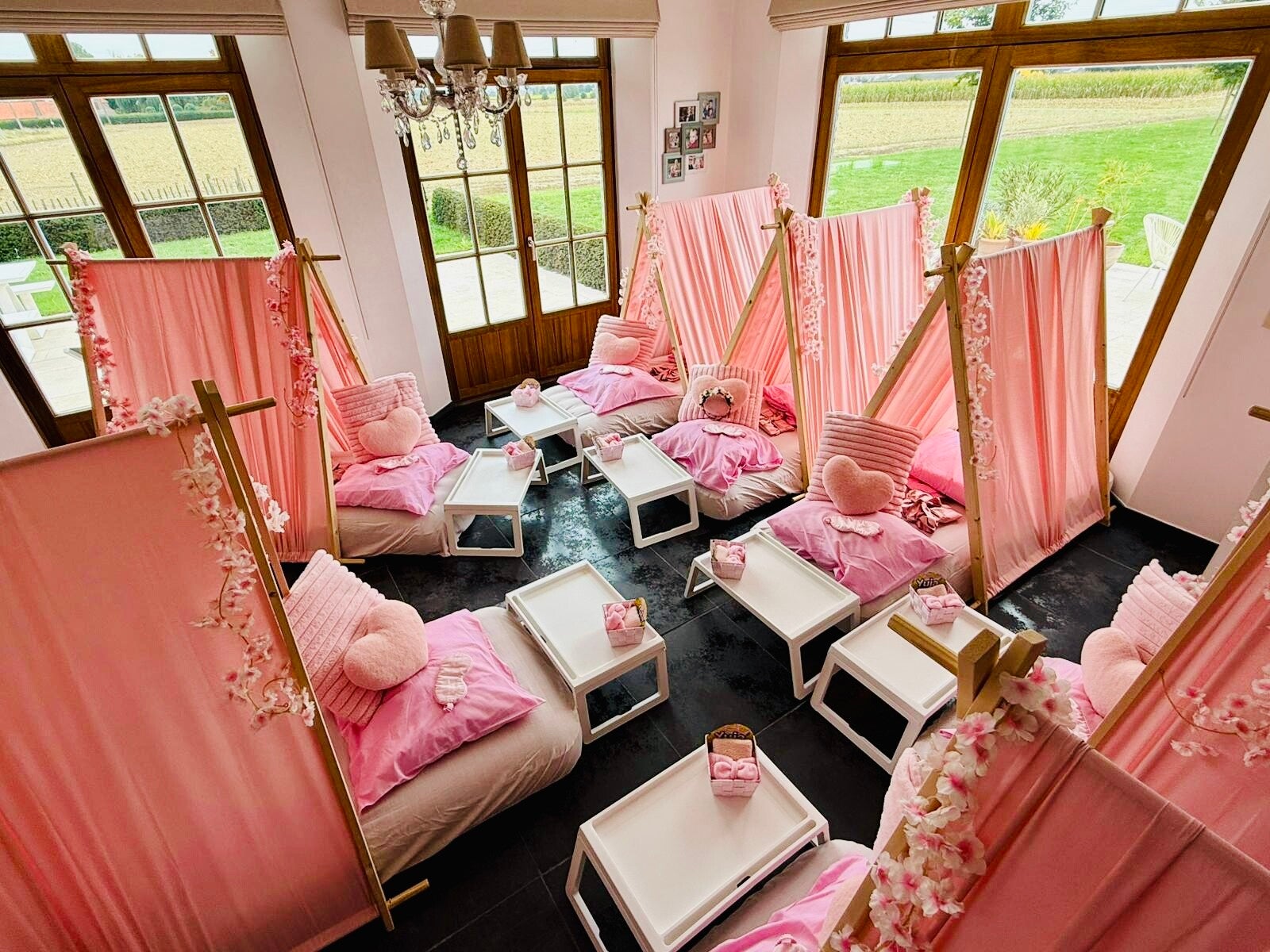 Onze tipitenten worden prachtig aangekleed met fluffy kussentjes, sfeervolle lichtjes, glinsterende decoratie en natuurlijk héél veel roze details. Alles staat klaar om jullie te laten genieten van een avond vol plezier, gezelligheid en echte girl vibes.